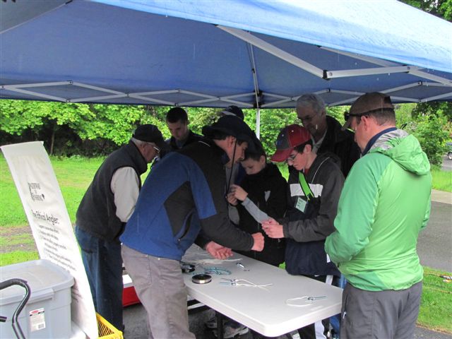 Huddled under a canopy in the pouring rain are volunteers, students and a teacher from Pioneer Middle School. They were learning how to tie a fishing knot during a field trip. The students were exposed to a range of outdoor topics at the Barn Beach Nature Center located in Leavenworth.