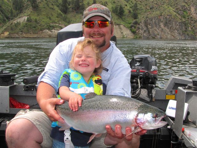 Jerrod Gibbons, Okanogan Valley Guide Service, has his daughter Katlynn in his lap, and a nice triploid rainbow in his hands. It was hooked at the lower net pens on Rufus Woods Reservoir.