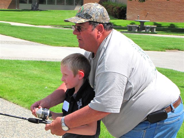 Ron Bruno, of the Wenatchee Sportsmen's Association, helps a young angler catch a fish from the fountain at Wenatchee Valley College. The event was put on by the Student Senate.