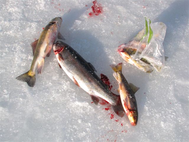 Here is a mixed bag of fish taken through the ice at Fish Lake. It included suckers, a pea chub, some perch and a triploid rainbow that must have weighed 4 pounds!