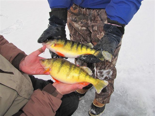 When you see anglers on the ice at Moses Lake you know something's being caught. Here are some examples; two jumbo perch. Good numbers of walleye are being taken, too.