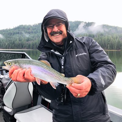 My plan for Tuesday was just another in a series of not-so-great choices I have made about where to go fishing recently. If your phone rings and indicates that I am calling, you may want it to let it go unanswered. My latest bright idea was to go to Fish Lake, near Lake Wenatchee. I had stopped by there the other day and spoke with Scott West at the Cove Resort. He told me that although he didn’t put any big triploids in the lake this year, the year before he put a bunch in that averaged 12 pounds. Here’s how I planned to approach the fishing on Tuesday. I would run two downriggers with some plugs for the really big fish and run two fly rods out the back for the rainbow. My brother in law Tom Verschueren would come along so we could run four rods. There was snow next to the road on the way up the Tumwater Canyon to the lake, and it was pouring down rain when we got there. I am sure he was looking daggers at my back while I rigged everything up, thinking “how did he talk me into this!” Well, once again my great plan failed. We didn’t get any big fish, and although we got lots of hits on our fly rods, only landed one 14-inch rainbow. Like I said, if I call—don’t answer!