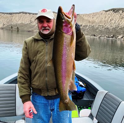 I got a really good report from my brother Rick on the fishing at Rufus Woods. He and my cousin Greg Preston spent a few days in Grand Coulee area and bounced around exploring Rufus Woods, Lake Roosevelt and even ran up to Porcupine Bay on the Spokane Arm. Rufus Woods was by far the best. On two separate outings that only lasted a few hours, due to wind, they caught double digit numbers of triploids. They were just side drifting and casting 1/4-ounce jigs to the shore and twitching them back to the boat. Rick thought that the trout were larger than usual. Many were in the 4- to 6-pound range, and one they figured weighed well over 10 pounds. They were launching at Seatons Grove and working their way down to the Nespelem Bar, across from the net pens. They did spend some time looking for walleye on Rufus, and even in Porcupine Bay. They got blown off before they could give this a decent try, or the flow just wasn’t strong to expect good fishing. They did a very nice unclipped rainbow on Lake Roosevelt. They estimated its weight at 3 ½ to 4 pounds.
