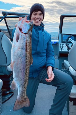 Josh Anantatmula shows off one of the triploid rainbow trout we caught on Rufus Woods Reservoir.
