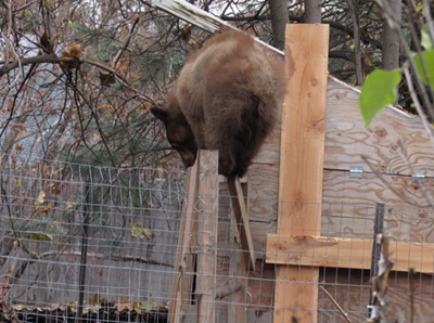 I reported earlier that we had a bear in our neighborhood. This young cinnamon phase bear was raiding my neighbor’s chicken coup. The bear would come into his pen, grab a bird, and then come over and eat it under the cedar tree in my front yard. My neighbor would add some more lumber to the outside of the coup to try to make it more secure, but the bear just kept coming back. He called the WDFW and Eric Boyd from enforcement came out and last Saturday placed a trap near the coup. On Sunday, my other neighbor called to warn us that the bear was just outside our house. Sure enough, we looked out the window and it was right there and headed for the coup. I grabbed my camera, and we watched the bear attempt to get inside, even climbing almost onto the roof. It couldn’t get in and eventually walked across the street and down the road. We’re all hoping the bear will take the bait and trip the trap and can be removed. We don’t want it killed. Please take precautions to you don’t attract a bear to your home and cause it to be eliminated.