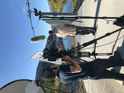 Here I am on the “set” on the launch below Wells Dam with the crew from North 40 Productions.
