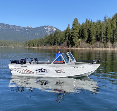 I was thrilled to tow home from Bob Feil Boats and Motors the Smoker Craft Phantom 20 X2 model that I will be driving this year. The folks in the shop did an excellent job getting the boat rigged. I wanted to get this boat wet as soon as possible. My wife always wants to go along on the first time I put a new boat in the water, to be sure everything is working right before I take anyone else out on the water. So, we ran up to Fish Lake for the maiden voyage. It was a beautiful calm day, with snow-capped peaks in the distance. Bald eagles were soaring and ospreys snatching fish off the surface. I decided to start the break in process with the main motor. I am sure that people were wondering what the heck I was doing. I would do slow laps then faster laps up and down the lake, as required to break in the motor in properly. I also ran the kicker and the Minn Kota bow mount electric. Everything ran perfectly. I was also very pleased with the performance of the Garmin fish finders, too. I can’t wait to do some fishing!