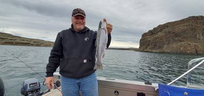 For FishingMagician.com, I'm Eric Granstrom. We pulled into our camping spot not far from Billy Clapp Lake Friday night at midnight. Marion and I worked a football game in Wenatchee Friday evening, so our departure was late. The 6am alarm Saturday morning was a little rude awakening, but we were launched and had all four lines in the water trolling around the basalt island by 7:30. We finally caught our first fish at 8:30 and I had high hopes for the day. Fish were surfacing all around us and the screen was loaded with arched indicators of plenty of fish in the water. I could even see darting lines on the screen where fish were taking a look at our gear, but nothing would bite. We threw everything in our box at them, with similar results. I tried varying our troll speed and going top water with Rapalas. Nothing. I finally got curious enough to see what was going on, thinking there may be a hatch going on in the lake, so I opened up the one fish we caught. Sure enough, it was loaded with bugs, and I didn't have any flies. More on Billy Clapp Thursday. Until next time, Good Fishing!