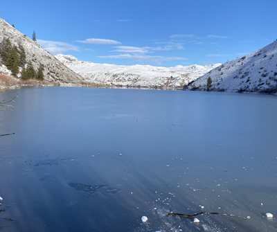 When I visited Rat Lake earlier in December it was half frozen. Soon anglers will be able to catch the big rainbow here.