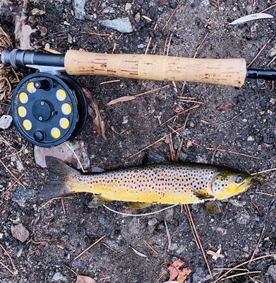 This brown pretty brown trout hit a brown and green leech pattern at Antilon Lake, which is in the hills above Manson.