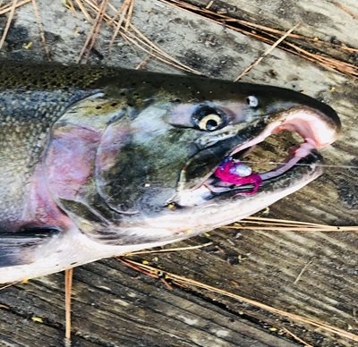 This coho, that I caught last year, looked pretty gnarly, but the meat was a deep red. I got it on a jig.