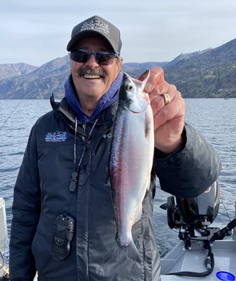 I had been watching the weather all week. My wife Eileen wanted to go fishing and Thursday looked like the day that we could get out on the water without having to battle the wind. It had been weeks since we were on Lake Chelan, so that’s where we went. We launched at the State Park and ran up above the Yacht Club. Here we saw a bunch of boats trolling for kokanee. First we lost a fish to a broken release, but then landed a double. I was having a hard time finding any schools of fish and so were most of the other boats. I did talk to a couple one boat that had stared in the lower basin at first light and had nine, but when they came up here only got three more. One angler stopped by to say hi and how much he enjoyed my reports and told me he and his wife had a great day. His neighbor gave him some kind of kokanee lure, so they gave it a try. They got nine kokanee, a lake trout and a 6- to 8-pound king, all on the same lure. A great day—I’ll say you bet!