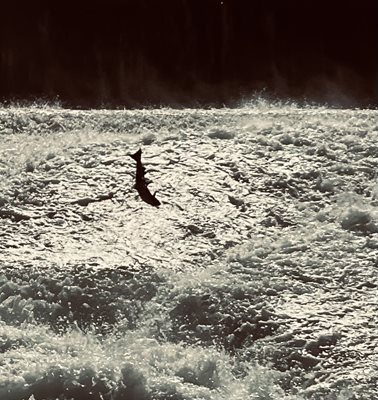 A sockeye does a cartwheel in the turbulent water before passing over Tumwater Dam on the Wenatchee River.