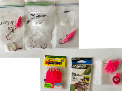 These photos show the hooks and hoochies and three-hook leaders I use for sockeye.