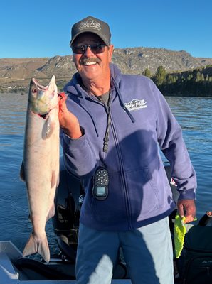 I finally got a crew together for a trip to Brewster to try the sockeye fishing. I had James Lebow, Michael Ericson and Keith Hyatt willing to get up at an ungodly hour to make the drive. It is important to be on station and ready to fish before the sun hits the water, so we all met in Wenatchee at 3 a.m. It worked out great, too. No waiting to put the boat in and we were in position with the large fleet of boats before first light. The bite started kind of late, though, and we really didn’t get into good action until about 5:30. We caught some and lost some on rods that were set up with hoochies and coon shrimp. We ran both ten-inch and 12-inch leaders with equal success, and although we had heard that fishing without hoochies was the way to go, it wasn’t the case. There were six ounce sinkers on the side rods and four ounces out the back. We caught fish along the west shore and at the top end off the mouth of the Okanogan River. The fish averaged about 3 pounds but did land one that was a probably a 5 pounder.