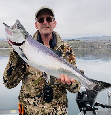 My brother Rick had a serious itch to catch a Chinook salmon on Lake Chelan. He and I got a chance to scratch that itch on Tuesday. Rick had organized all the gear we needed, and we put four rods out after launching at Mill Bay and pointing the boat down lake. The rods were spaced at different depth from roughly 200 to 120 feet deep. The hooks were behind dodgers and dressed up with either his special salmon flies that he ties specifically for Lake Chelan or plug cut herring. We ran down to about as far as the Blue Roofs and then turned back up lake, trolling at about 1.7 mph. We hadn’t made it very far when the bell on a rod that was at the 140-foot depth jangled, and the line popped free of the rigger. We both saw the line coming up and knew it was a king. I cleared the other rods and got the net. Soon we had a bright lake Chelan Chinook next to the boat and I netted it. We both celebrated and shot some photos of the 6-pound fish. The fish is on display at Hooked on Toys in Wenatchee.