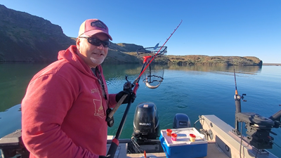 For FishingMagician.com, I'm Eric Granstrom. Marion and I had a free weekend so we headed for Billy Clapp Lake to do some fishing. The water level is in great shape with the dock ready to launch any sized boat. The winds were stiff and thunderheads were rolling across the horizon Saturday and the bite was off. Sunday was completely different with sunshine and hardly a breath of wind and we were able to catch two, nice limits of rainbow trout. We were trying for kokanee using dodgers, hoochies and dyed corn, but were certainly happy to have rainbow as a by-catch. We got all of our gear in the water and caught our first fish by 7am. I figured the fish would be closer to the surface in the early morning hours so the downriggers were set with lines at 10, 20, 30 and 40 feet. At first, I had the gear 100-pulls back from the downrigger clips, but shortened to 50-pulls as the morning went along. We mostly trolled around the basalt island in 80-feet deep water but also caught fish trolling outside in up to 120-feet of water. You can see the video on our Facebook page. Until next time, Good Fishing!