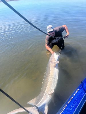 For FishingMagician.com, I'm Eric Granstrom. We've all heard the fish stories. "Oh, it was the one that got away!" Well, I have a story of the one that DIDN'T get away. Kennewick resident Loren Monson was out walleye fishing Sunday on the Columbia River with his dad Laren. He'd had good luck using his favorite Buffalo rig off a 3-ounce bottom walker when he hung up. Or at least he thought. When they turned the boat around to try to get his lure back, he noticed the "log" was headed downstream. Five minutes later, the Monson's were shocked to see an 8-foot sturgeon burst through the surface, tail-dance, and splash, zipping line off his Abu Garcia 10.6 rod. Loren told me the fight was on for an hour and a half. He'd gain six inches at a time, get it up to the surface only to have a boat buzz by and back down it would go. They finally got it up to the surface next to the boat and Laren grabbed for its mouth only to find a circle hook. They finally coaxed it to shore, removed the circle hook and sent the 8-foot, 200-pound fish on its way. Until next time, Good Fishing!