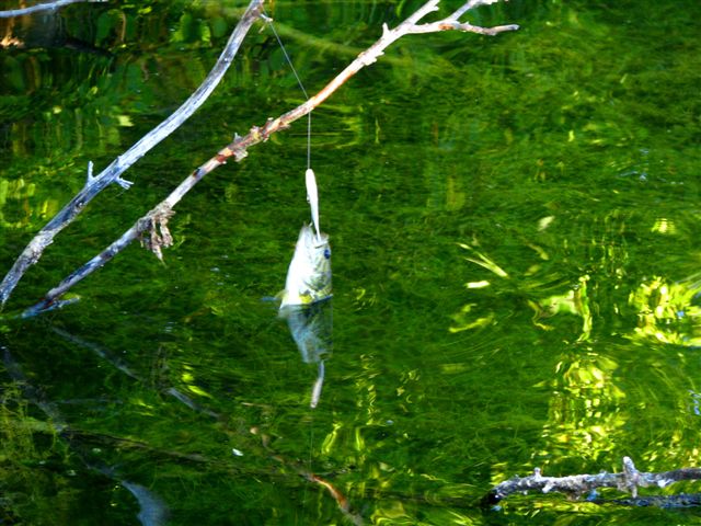 One of my casts at Curlew Lake went over a small stick. When I tried to slowly retreive it, this bass grabbed it while it was hanging over the water!