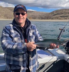 Alan Greenbalgh shows off a 17-inch kokanee he got while we were fishing with Jim Paine on Lake Roosevelt. He got a 23-incher earlier in the week.