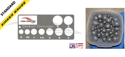 On the right is a photo of my current method of storing lead balls for fishing. As you can imagine the size of the each ball that is stamped on the lead is worn off in no time. I am left with trying estimate the size of one I want to use by eye balling the ones closest to what I guess is the right size. Fish Fighter Products has solved this problem for me by coming out with a very handy Sinker Gauge, shown on the left. I can easily tell what weight each lead ball is by sliding it through the appropriate hole. This gauge sizes lead balls from .5 ounces up to six ounces, and they have another that goes from 8 ounces up to 20 ounces. This is just one of many innovative fishing products that can be found at