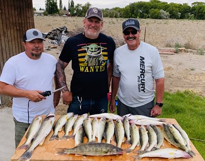 James Lebow is on the left and Ryan Harris in the middle with our catch of walleye from Potholes Reservoir.