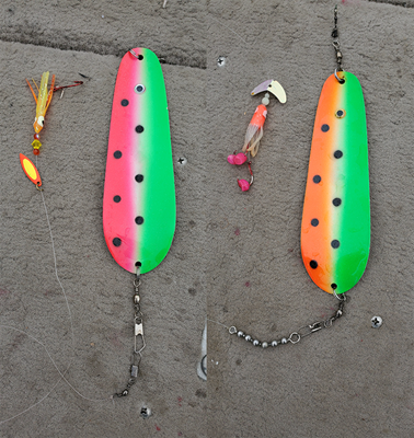 For FishingMagician.com, I'm Eric Granstrom. Finally! After months of the boat shivering inside our shop, we broke it out and went fishing at Lake Chelan Sunday. My Dad came over the hill from the west side for the weekend and with the weather outlook positive, we planned to fish kokanee. Of course, after losing an hour of sleep with the time shift Saturday night, we were a little later than I wanted to be on Sunday, launching from Mill Bay at 9:45. I had heard the fishing might be good up at 25-Mile Creek, so up the lake we motored. Rods were stacked on the downriggers by 10:30 and we had our first hit within 5-minutes. We found fish anywhere from 70-feet deep to the surface in anywhere from 150-to-350 feet of water. I put a wide range of flashers and lures on to start, but it quickly became apparent that orange, yellow & pink combinations were the ticket. I had three different scented corns mixed, but the pink-dyed, Kokanee flavor from Northwest Bait and Scent was the winner. We ended up with 13 in the box before we got too cold to go any longer. It was a great day! Until next time, Good Fishing!