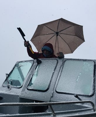 Here’s my wife Eileen scraping snow off the windshield at the launch at Lake Chelan.