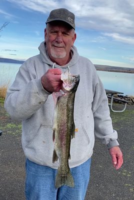 Wondering where to spend last Sunday I recalled that I used to touch base with Rosie, who worked with Gordon Steinmetz at Big Walley’s in Coulee City. She loved to fish Banks in the fall and winter and did so mostly from the breakwater at the Coulee City Marina. She caught a lot of dandy rainbow here, so I thought I would start my day here. I parked out on the point and put two rods out. Nothing was happening for me, and I noticed a guy across the way, and it looked like he was cleaning fish. I packed up and drove over there and sure enough he had just landed two rainbow. One was about 12 inches long and the other was at least 22 inches long. His name was Mark and he had traveled from Buckley to fish here—because years ago he had met Rosie and she showed him how to fish here! He was planning to fish the day here at the marina, spend the night and hit again in the morning. I checked on him later and he had added another nice rainbow to his stringer. He may have limited before he left for dinner.